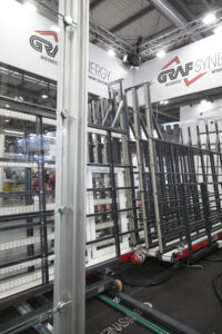 Graf Synergy a également présenté lors de la foire son idée de magasin automatique pour la gestion des panneaux et des cadres pendant les phases d’assemblage après le soudage.