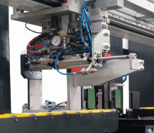 Le mandrin servo-ventilé est contrôlé par un axe CNC qui régule la vitesse de rotation en fonction du matériau, tandis que le système d’évacuation avec pince à 4 axes contrôlés complète le cycle de traitement de manière sûre et efficace.